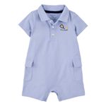 Enterizo azul tipo polo para bebé niño, manga Corta, botones delanteros, bolsillos Laterales, broches de presión entre piernas. 100% Punto Jersey Ligero De Algodón. Importado. Lavar a máquina.