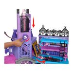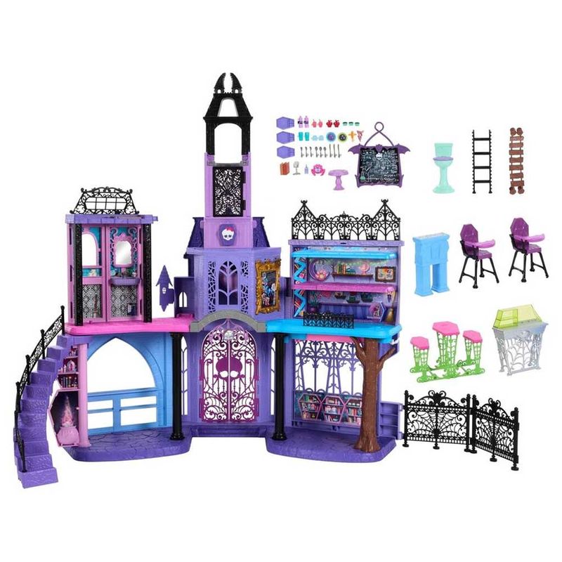 Set de juego Haunted High School! Esta casa de muñecas Screamium cuenta con juego de 360 grados, múltiples sorpresas y más de 35 piezas de narración para aventuras escalofriantes. Descubre los encantos escalofriantes de Monster High a través de más de 7 áreas de juego, incluyendo una creepateria, aula, baño y dormitorio con capacidad para hasta 3 muñecas. ¡Las sorpresas esperan! Gira la escalera para revelar la sala de pociones oculta, luego encuentra los 2 pasillos secretos para transformaciones secretas de tobogán y trampilla. Accesorios como sillas de escritorio, muebles de comedor creepateria y piezas de comida y bebida fantásticas inspirarán todo tipo de historias espeluznantes. No incluye Muñecas, se venden por separado.