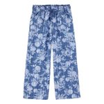 Pantalón azul estampado floral para niña, abertura de pierna ancha, llega al tobillo, cinturilla elástica completa, cordón de ajuste funcional, diseño de 3 bolsillos. 58 % algodón, 42 % viscosa. Importado. Lavable en la lavadora.