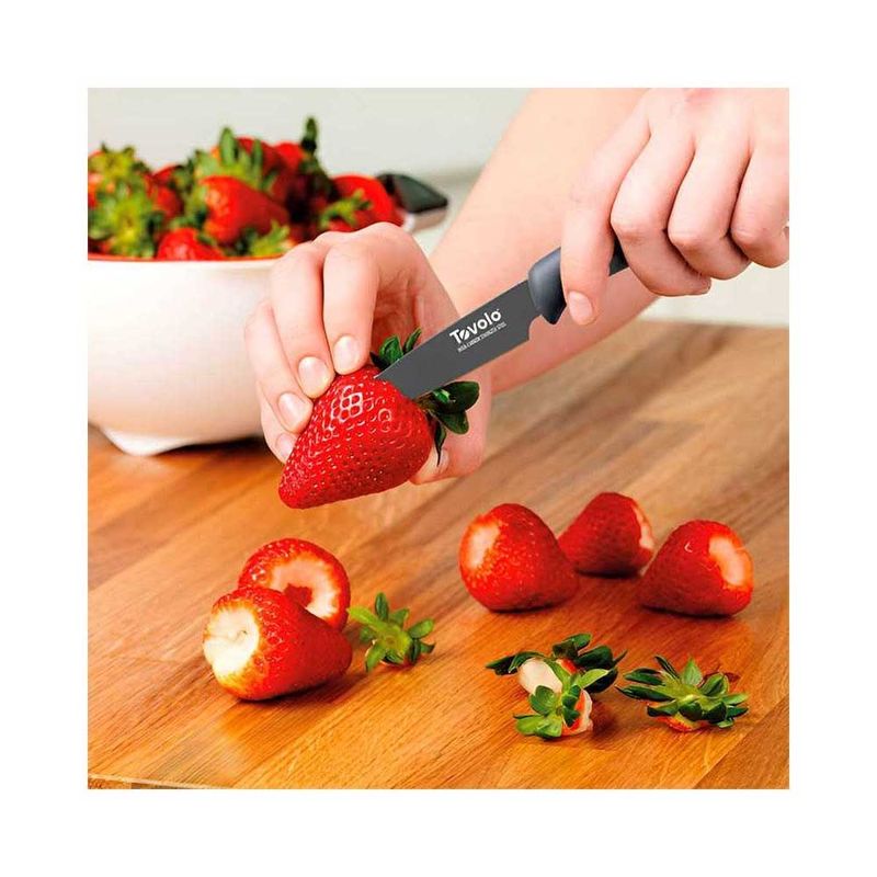 El acero inoxidable con alto contenido de carbono es extremadamente afilado, duradero y conserva su filo durante años. Guarde estos cuchillos de forma segura en un armario o cajón con las fundas incluidas. Agarre firme: Los mangos contorneados ofrecen un agarre seguro, lo que los hace perfectos para pelar y cortar en dados. Construcción robusta: Fabricados con acero inoxidable con alto contenido de carbono y nailon y silicona sin BPA, estos cuchillos están diseñados para durar. Dimensiones y cuidado: Mide 1,3 cm de largo x 14,5 cm de ancho x 27,5 cm de alto. Para limpiar, lave con agua y jabón. Apto para lavavajillas.